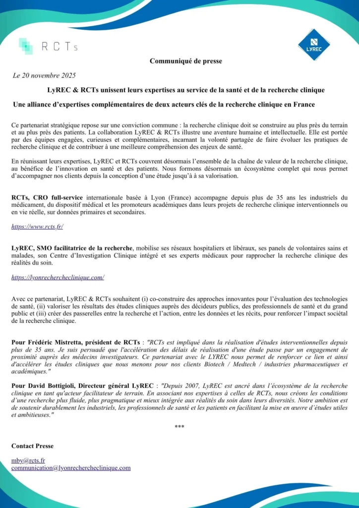 LyREC & RCTs, une alliance d’expertises complémentaires de deux acteurs clés de la recherche clinique en France.